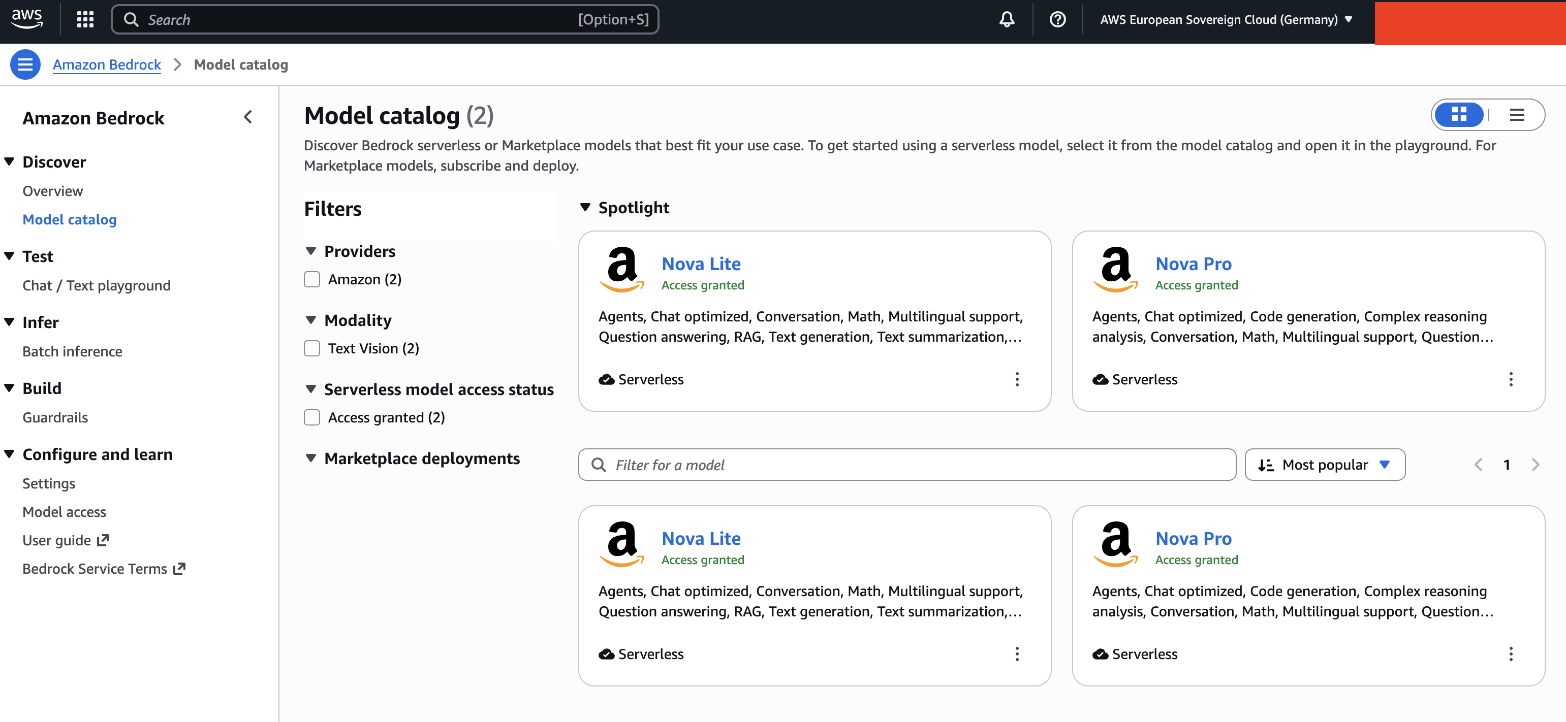 As a result, Amazon Bedrock offers a very limited selection, specifically the Amazon Nova models. While we are spoiled for choice with Claude or Llama in the regular cloud, the options in ESC are restricted.